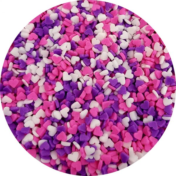 סוכריות לקישוט לבבות סגול ורוד לבן 3 מ"מ – 70 גרם.